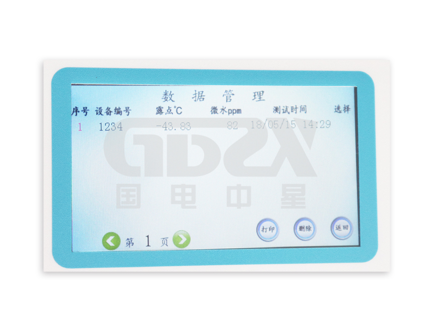 彩色液晶屏直接顯示露點、微水(ppm)、環(huán)境溫度、環(huán)境濕度、時間及日期等內(nèi)容。