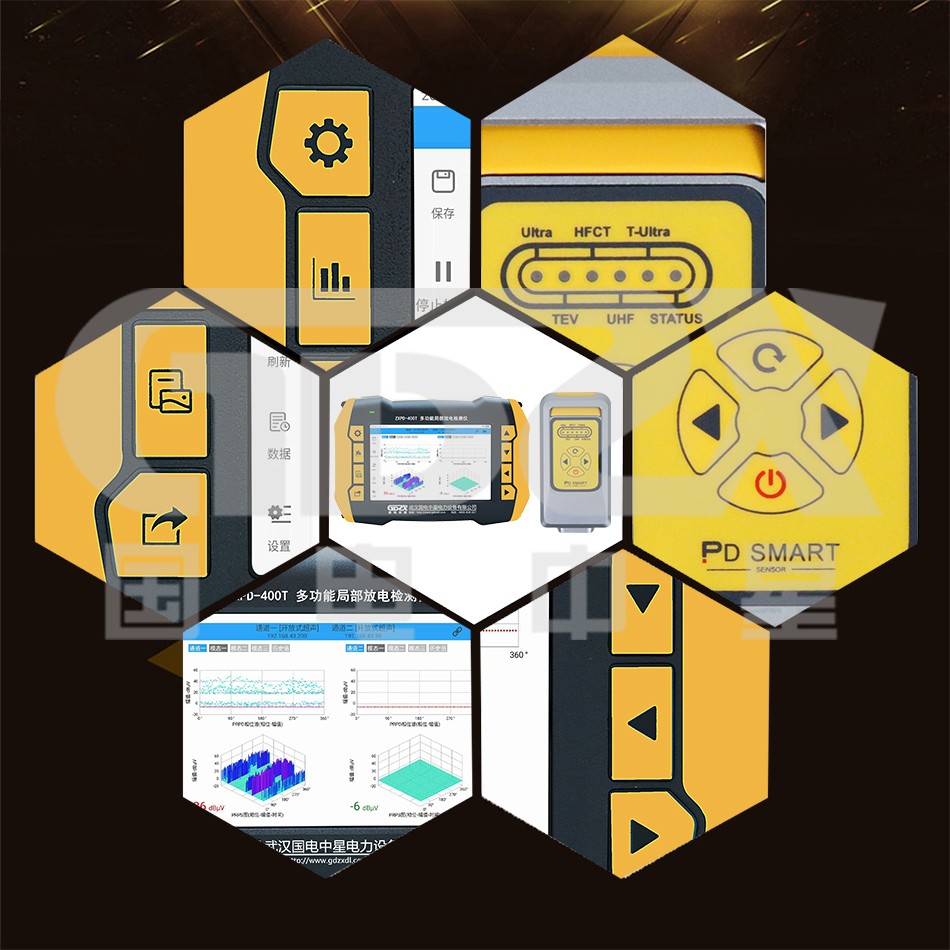 2. 內(nèi)置超聲波傳感器和暫態(tài)地電壓(以下簡稱TEV)傳感器,可外接變壓器、GIS、架空線路、電纜等專用傳感器;
